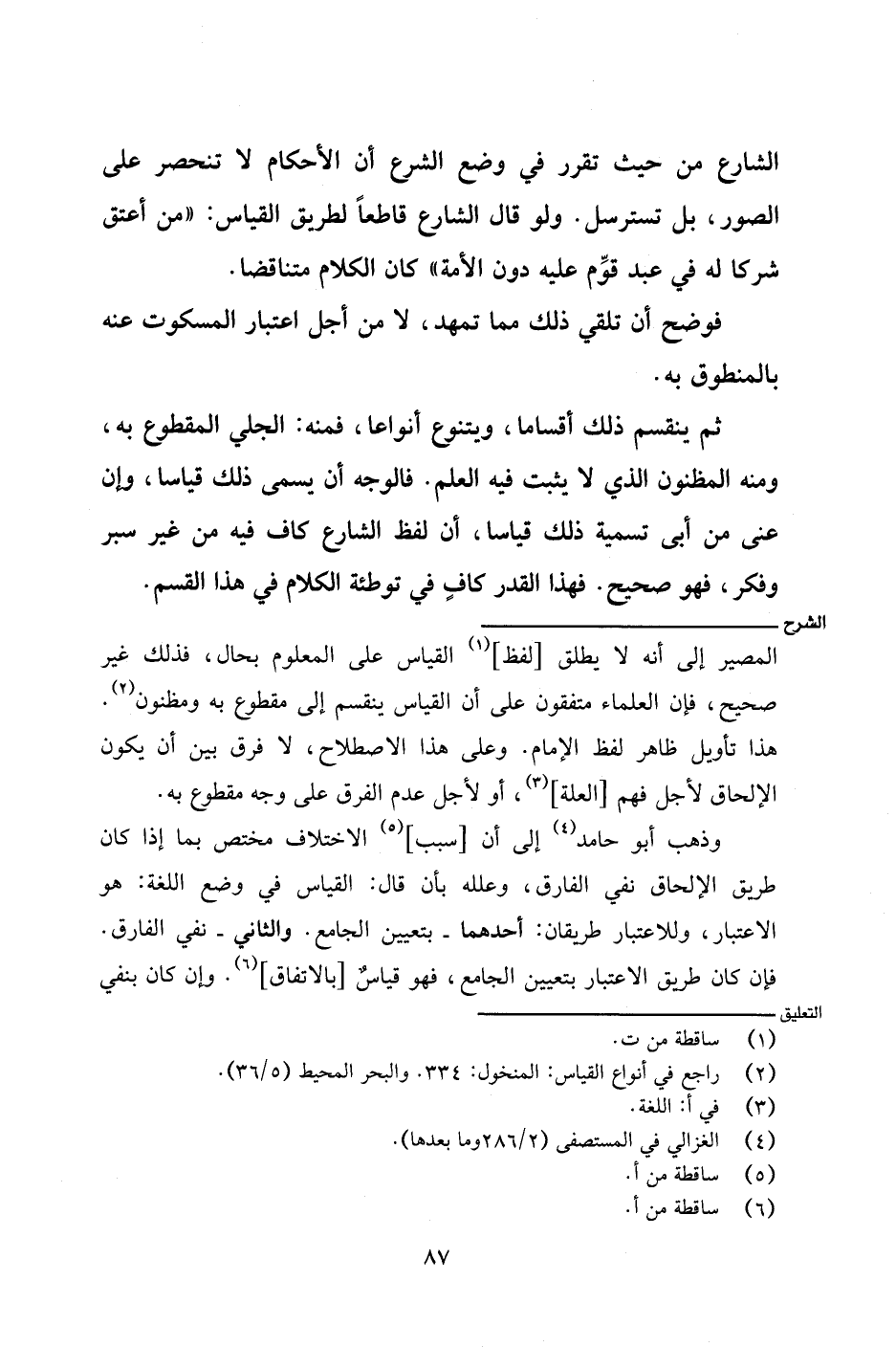 المصير إلى أنه لا يطلق [لفظ] القياس على المعلوم بحال، فذلك غير صحيح، فإن العلماء متفقون على أن القياس ينقسم إلى مقطوع به ومظنون. هذا تأويل ظاهر لفظ الإمام. وعلى هذا الاصطلاح، لا فرق بين أن يكون الإلحاق لأجل فهم [العلة]، أو لأجل عدم الفرق على وجه مقطوع به.