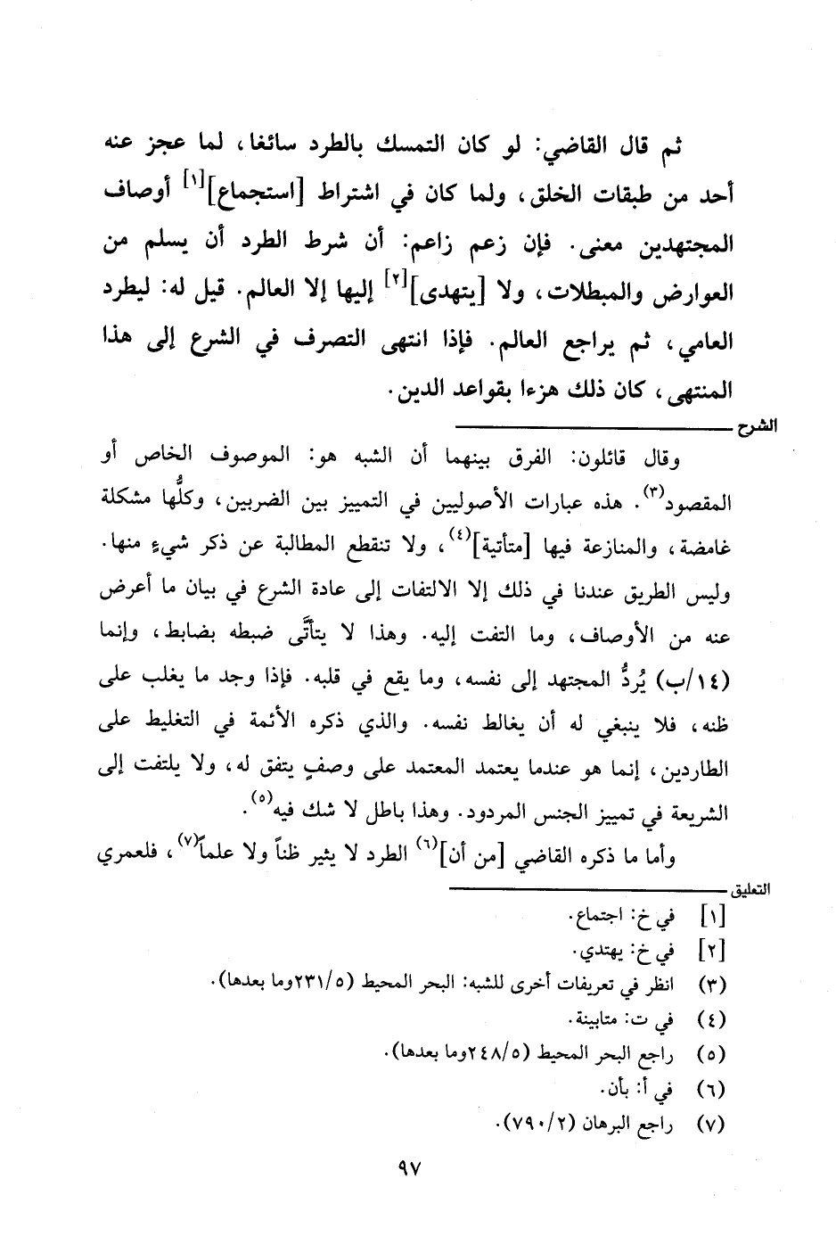 وقال قائلون: الفرق بينهما أن الشبه هو: الوصوف الخاص أو المقصود. هذه عبارات الأصوليين في التمييز بين الضربين، وكلها مشكلة غامضة، والمنازعة فيها [متأتية]، ولا تنقطع المطالبة عن ذكر شيء منها. وليس الطريق عندنا في ذلك إلا الالتفات إلى عادة الشرع في بيان ما أعرض عنه من الأوصاف، وما التفت إليه. وهذا لا يتأتى ضبطه بضابط، وإنما (١٤/ب) يرد المجتهد إلى نفسه، وما يقع في قلبه. فإذا وجد ما يغلب على ظنه، فلا ينبغي له أن يغالط نفسه. والذي ذكره الأئمة في التغليظ على الطاردين، إنما هو عندما يعتمد المعتمد على وصفٍ يتفق له، ولا يلتفت إلى الشريعة في تمييز الجنس المردود. وهذا باطل لا شك فيه.