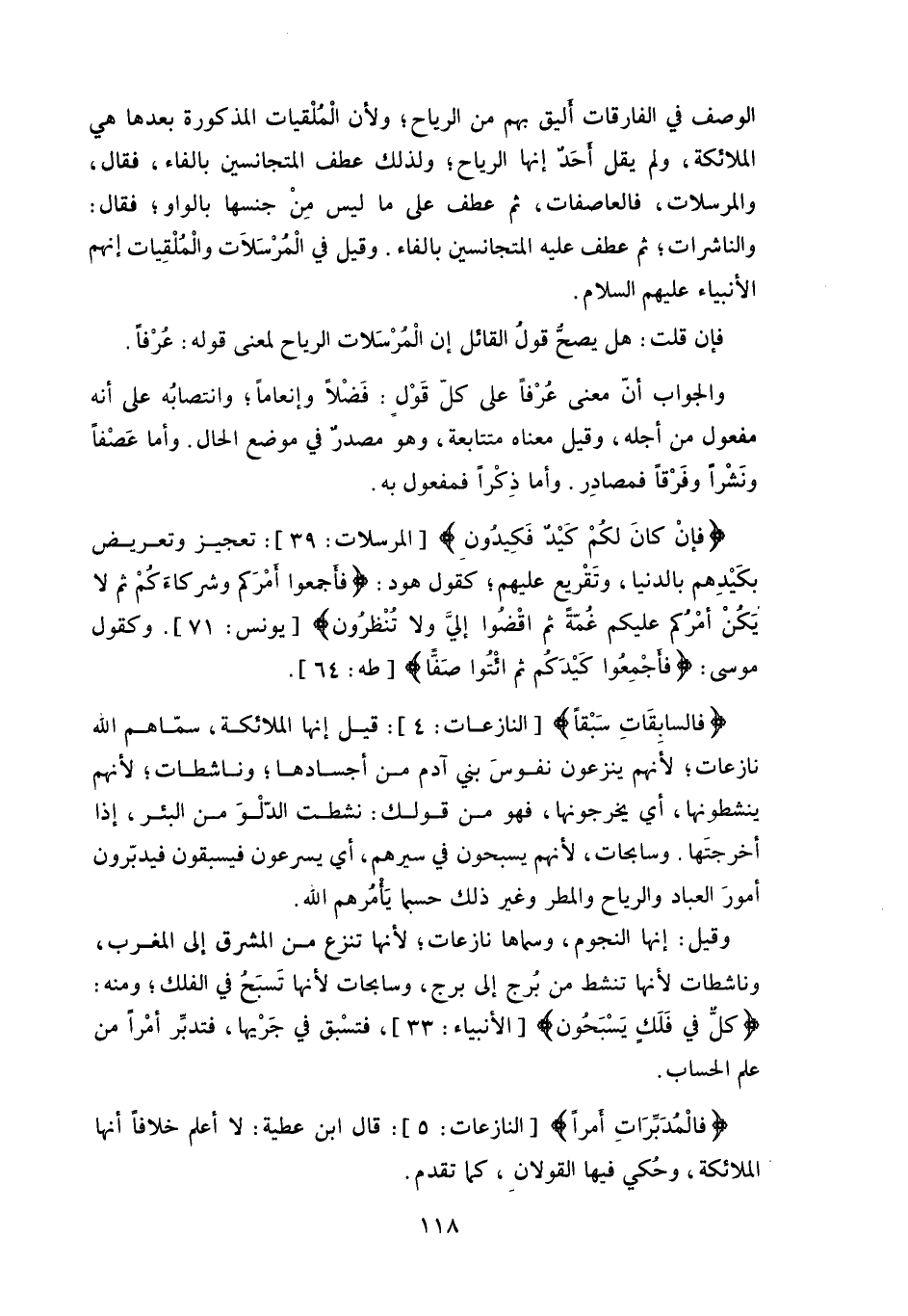 لأنَّ الوصف في الفارقات أليق بهم من الرياح، ولأن الْمُلْقيات المذكورة بعدها هي الملائكة، ولم يقل أحَدٌ إنها الرياح، ولذلك عطف المتجانسين بالفاء، فقال، والمرسلات، فالعاصفات، ثم عطف على ما ليس مِنْ جنسها بالواو، فقال: والناشرات، ثم عطف عليه المتجانسين بالفاء.