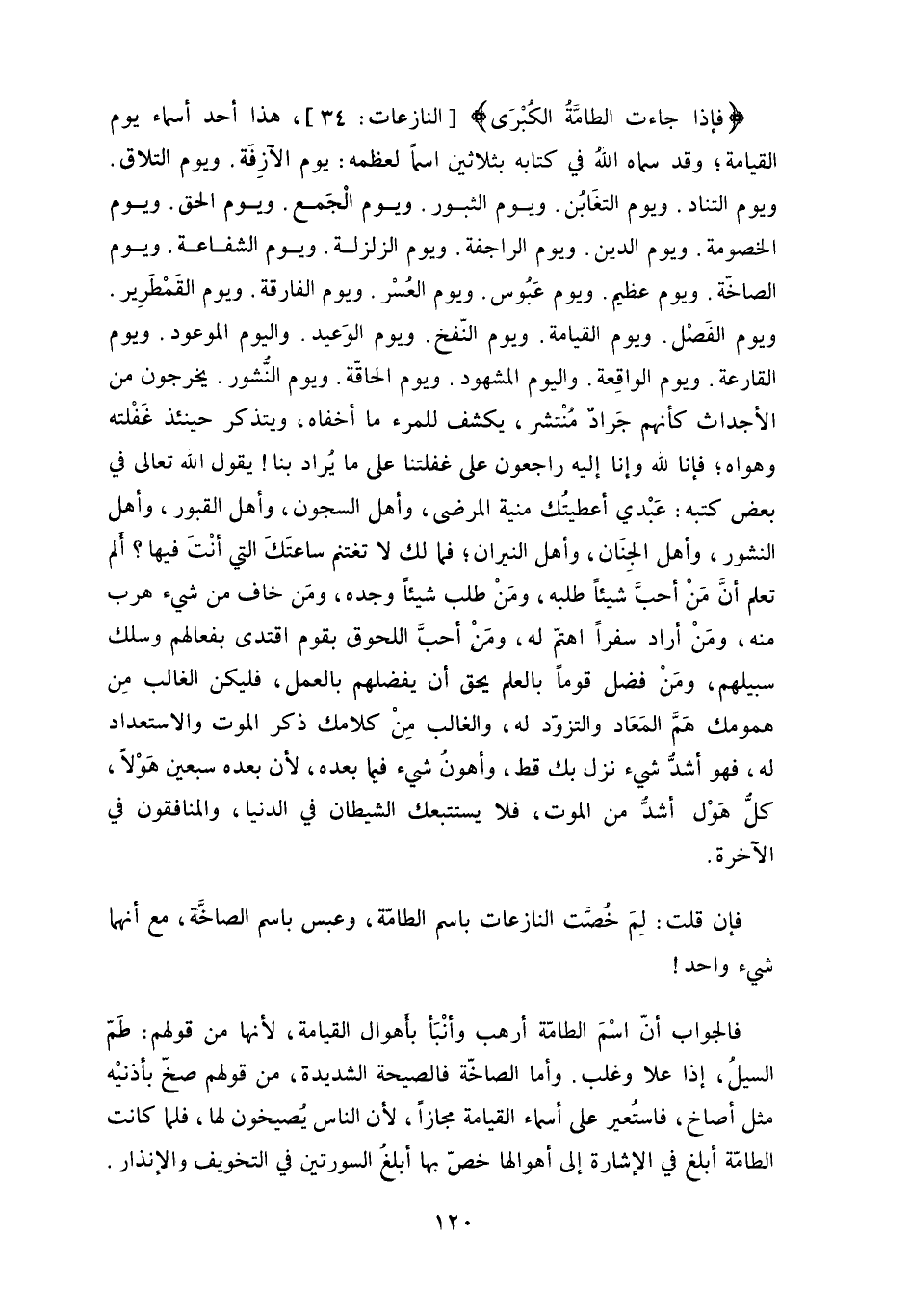فإن قلت: لِمَ خُصَّت النازعات باسم الطامَّة، وعبس باسم الصاخَّة، مع أنهما شيء واحد؟