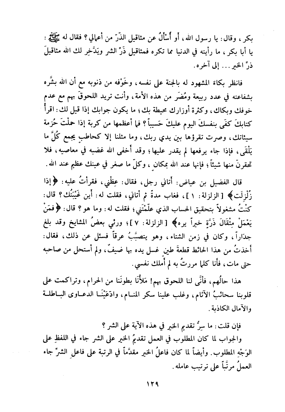 وقال: يا رسول الله، أو أُسأل عن مثاقيل الذّرّ من أعمالي، قال له - عز وجل -: يا أبا بكر، ما رأيته في الدنيا مما تكره فمثاقيل ذَرِّ الشر ويَدَّخِر لك الله مثاقيلَ ذرِّ الخير. . . إلى آخره.
