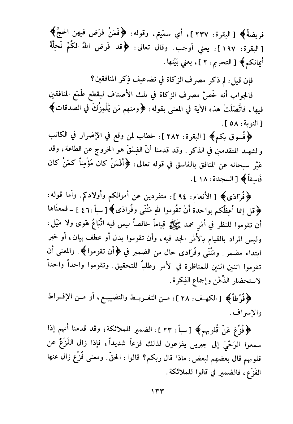 وقال تعالى: (وقد فَرَضْتُم لهن فريضة) ، أي سمّيتم، وقوله: (فَمَنْ فرَض فيهن الحج) : يعني أوجب.
