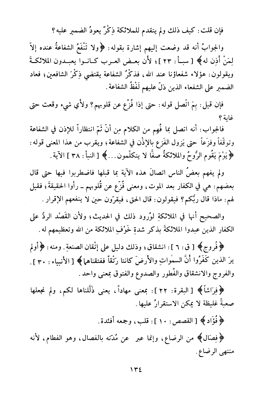 والجوابُ أنه قد وضعت إليه إشارة بقوله: (وَلَا تَنْفَعُ الشَّفَاعَةُ عِنْدَهُ إِلَّا لِمَنْ أَذِنَ لَهُ) ، لأن بعض العرب كانوا يعبدون الملائكةَ ويقولون: هؤلاء شفعاؤنا عند الله، فذكْر الشفاعة يقتضي ذِكْرَ الشافعين، فعاد الضمير على الشفعاء الذين دَلّ عليهم لَفْظ الشفاعة.