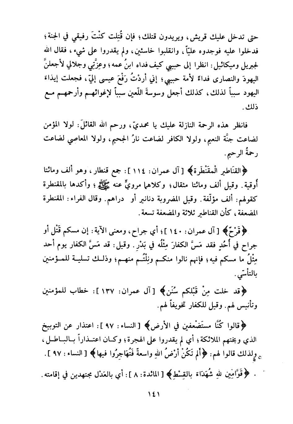 فدخلوا عليه فوجدوه عليًّا، وانقلبوا خاسئين، ولم يقدروا على شيء، فقال الله لجبريل وميكائيل: انظرا إلى حبيبي كيف فداه ابنُ عمه، وعِزَّتِي وجلالي لأجعلن اليهودَ والنصارى فداءً لأمة حبيبي، إني أردْتُ رَفْعَ عيسى إليَّ، فجعلت إيذاء اليهود سببا لذلك، كذلك أجعل وسوسةَ اللّعين سبباً لإغوائهم وأرحمهم مع ذلك.