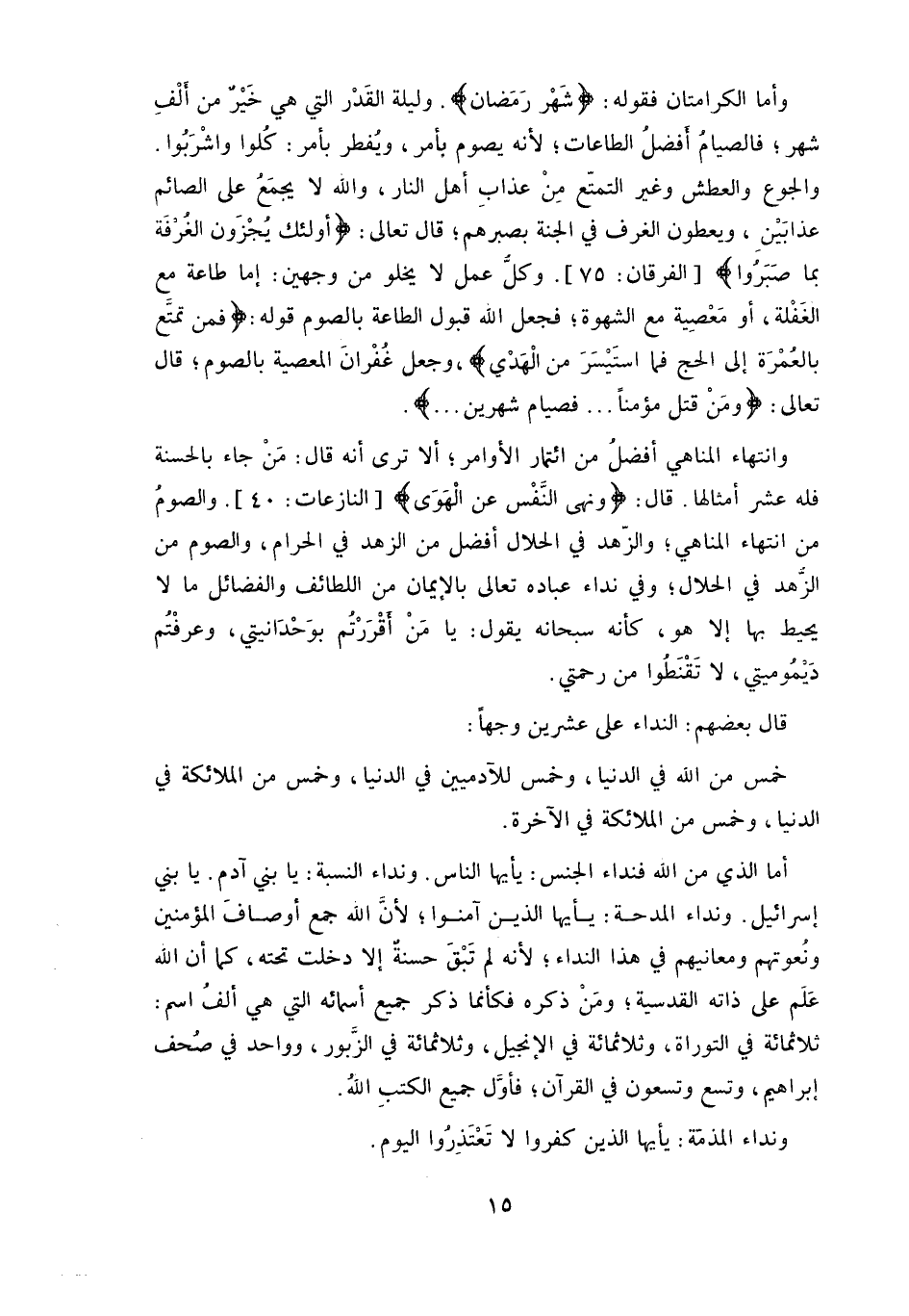 والصوم من انتهاء المناهي، والزّهد في الحلال أفضل من الزهد في الحرام، والصوم من الزهد في الحلال، وفي نداء عباده تعالى بالإيمان من اللطائف والفضائل ما لا يحيط بها إلا هو، كأنه سبحانه يقول: يا مَنْ أقْرَرْتم بوَحْدَانيتي، وعرفْتم دَيموميتي، لا تَقْنَطوا من رحمتي.