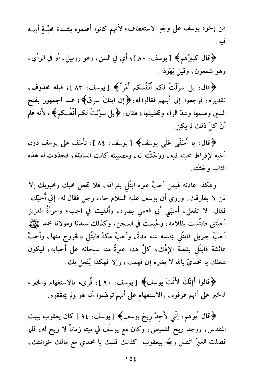 (قال بل سوَّلَتْ لكم أنْفسُكم أمْراً) ، قبله محذوف، تقديره: فرجعوا إلى أبيهم فقالوا له: (إن ابنكَ سرق) ، عند الجمهور بفتح السين وضمها وشدّ الراء وتخفيفها، فقال: (بل سوَّلَتْ لَكم أنْفسكم) ، لأنه علم أَنَّ كلَّ ذلك لم يكن.