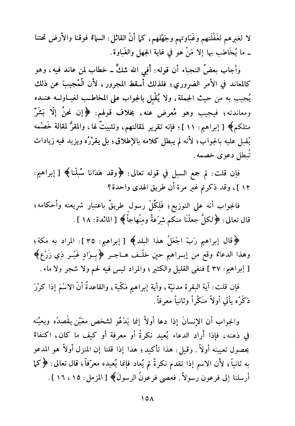 فإن قلت: آية البقرة مدنيَّة، وآية إبراهيم مَكية، والقاعدة أنَّ الاسمَ إذا كرر ذكرُه يأتي أولاً منَكَّراً وثانياً معرفاً؟