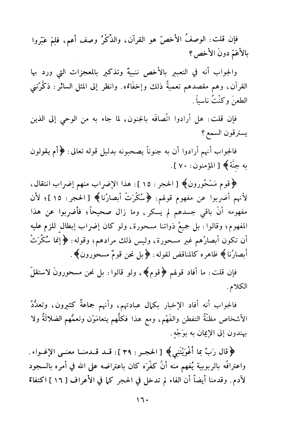 فإن قلت: هل أرادوا اتّصافَه بالجنون، لما جاء به من الوحي إلى الذين