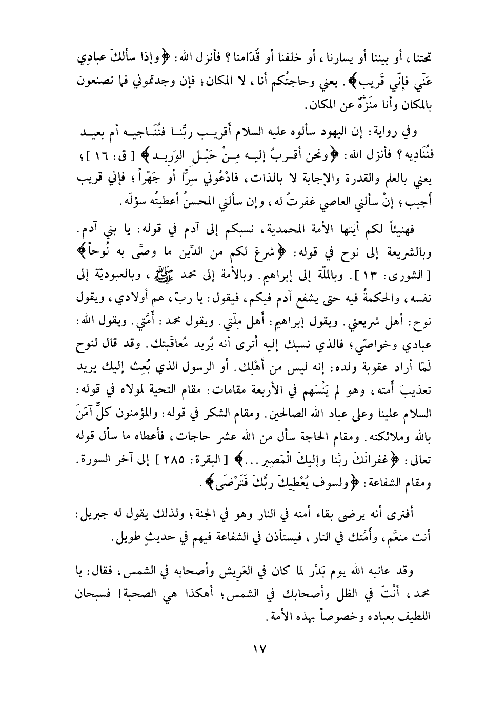 أو الرسول الذي بعِث إليك يريد تعذيبَ أمته، وهو لم ينْسَهم في الأربعة مقامات: مقام التحية لولاه في قوله: "السلام علينا وعلى عباد الله الصالحين".