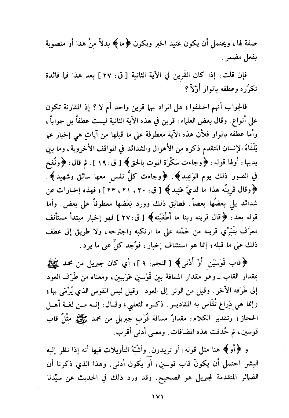 وأشبَهُ التأويلات فيها أنه إذا نظر إليه البشر احتمل أن يكونَ قاب قوسين، أو يكون أدنى.