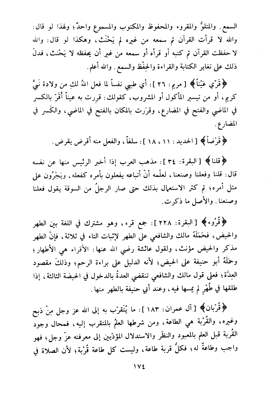ما يتَقرَّب به إلى الله عز وجل مِنْ ذبح وغيره، والقُرْبة هي الطاعة، ومن شرطها العلمُ بالمتقرب إليه، فمحال وجود القُربة قبل العلم بالمعبود والنظَر والاستدلال المؤدّيين إلى معرفته عزّ وجل، فهو واجب وطاعةٌ له، فكل قربة طاعة، وليست كل طاعة قُرْبة، لأن الصلاة في