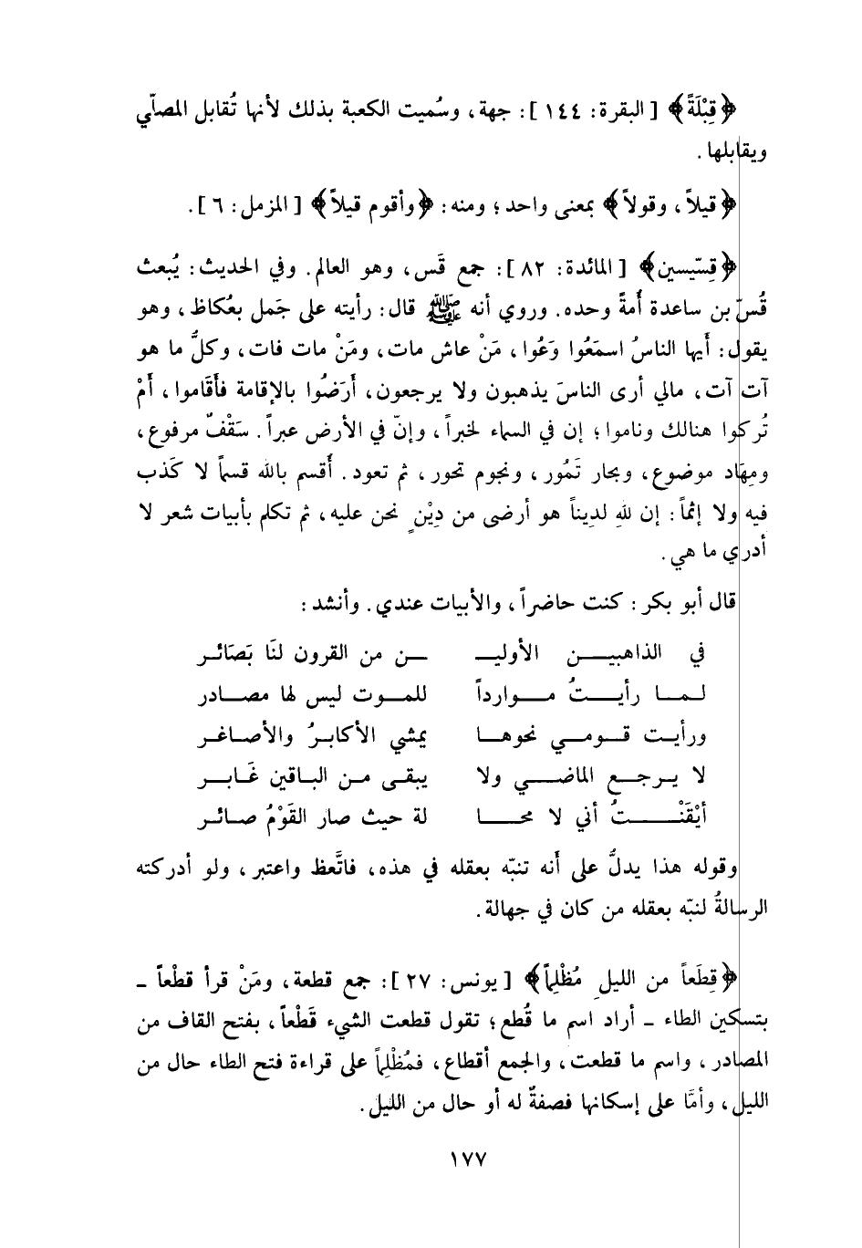 يقول: أيها الناس اسمَعُوا وَعُوا، مَنْ عاش مات، ومَنْ مات فات، وكلّ ما هو آت آت، مالي أرى الناسَ يذهبون ولا يرجعون، أرَضُوا بالإقامة فأقَاموا، أمْ تركوا هنالك وناموا، إن في السماء لخبرًا، وإنَّ في الأرض عبراً.