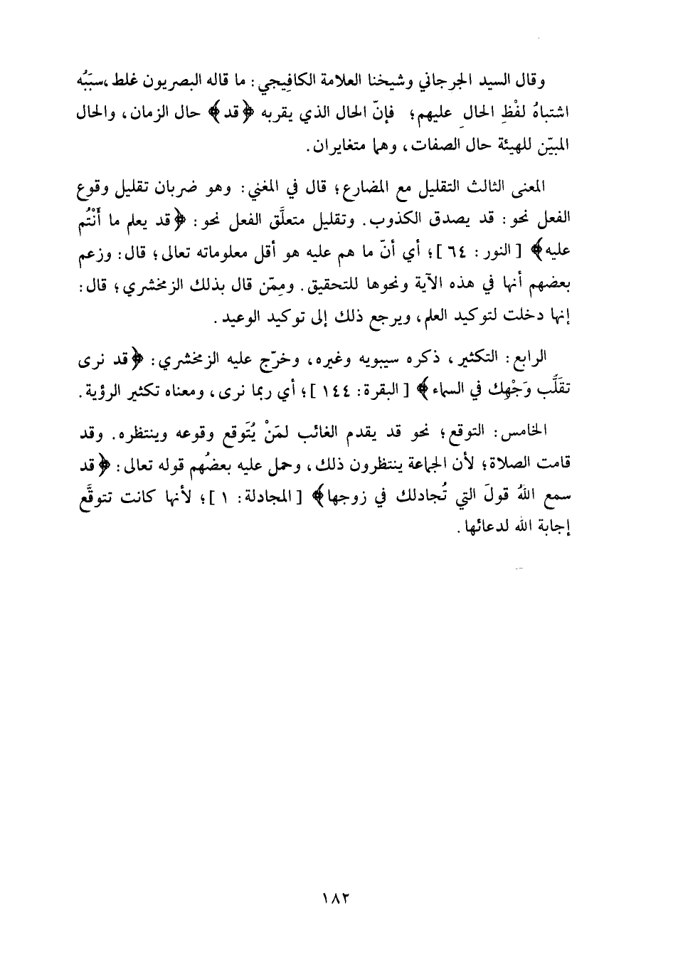 وقال السيد الجرجاني وشيخنا العلامة الكافِيجي: ما قاله البصريون غلط، سبَبه اشتباه لفْظِ الحالِ عليهم، فإنَّ الحال الذي يقربه (قد) حال الزمان، والحال المبيّن للهيئة حال الصفات، وهما متغايران.