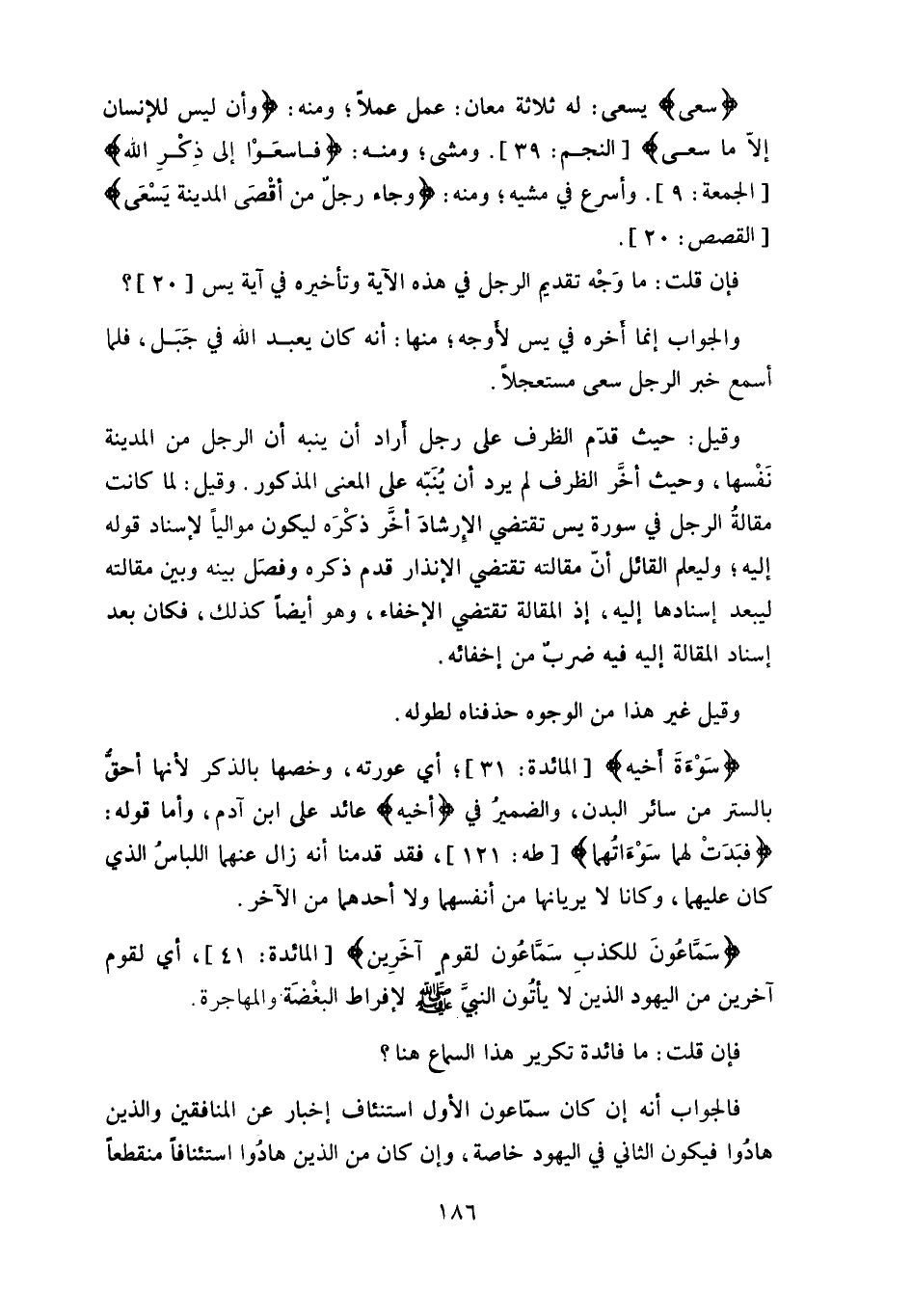 (سعى) يسعى: له ثلاثة معان، عمل عملاً، ومنه: (وأن ليس للإنسان