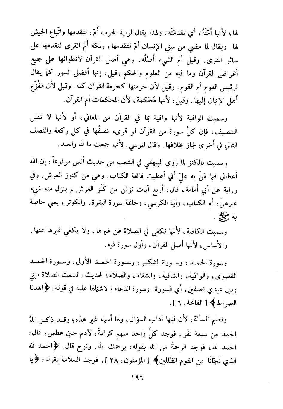 وسورة الحمد القصوى، والواقية، والشافية، والشفاء، والصلاة، لحديث: قسمت الصلاة بيني وبين عبدي نصفين، أي السورة.