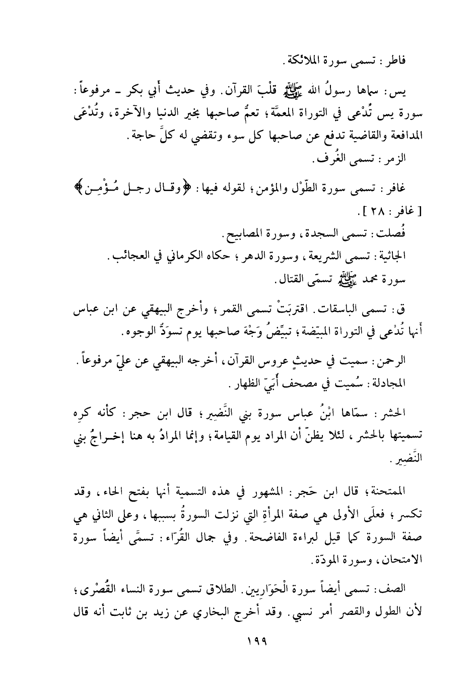 الحشر: سمّاها ابنُ عباس سورة بني النَّضِير، قال ابن حجر: كأنه كرِه