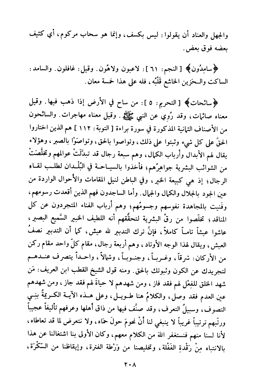 والسائحون من الأصناف الثمانية المذكورة في سورة براءة، هم الذين اختاروا الحقَّ على كل شيء وثبتوا على ذلك، وتواصوا بالحق، وتواصَوْا بالصبر، وهؤلاء يقال لهم الأبدال وأرباب الكمال، وهم سبعة رجال قد تبدَّلتْ عوالمهم وتخلَّصَتْ من الشوائب البشرية جواهِرُهم، فأخذوا بالسياحة في البُلْدان لطلب لقاءِ الرجال، إذ هي كبيعة الخير، وفي الباطن لنيل المقامات والأحوال الواردة من عين الجود بالجلال والكمال والجمال.