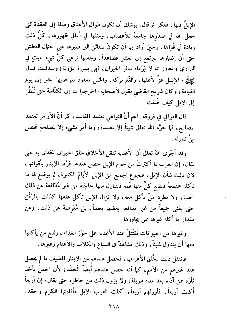 الإبل فيها، ففكر ثم قال: يوشك أن تكون طوال الأعناق وصلة إلى العقدة التي جعل الله في صَدْرِها جامعةً للأعصاب، ومثلها في أعالي ظهورها، كلَّ ذلك زيادة في قواها، وحين أراد بها أن تكونَ سفائن البر صبرها على احتمال العطش حتى أن إضمارها ليرتفع إلى العشر فصاعداً، وجعلها ترعى كل شيء نابتٍ في البراري والمفاوِز مما لا يَرْعاه سائر الحيوان، فهي يسيرة المؤونة، ولذلك قال - صلى الله عليه وسلم -: "الإبل عزّ لأهلها، والغَنم بركة، والخيل معقود بنواصيها الخير إلى يوم القيامة".