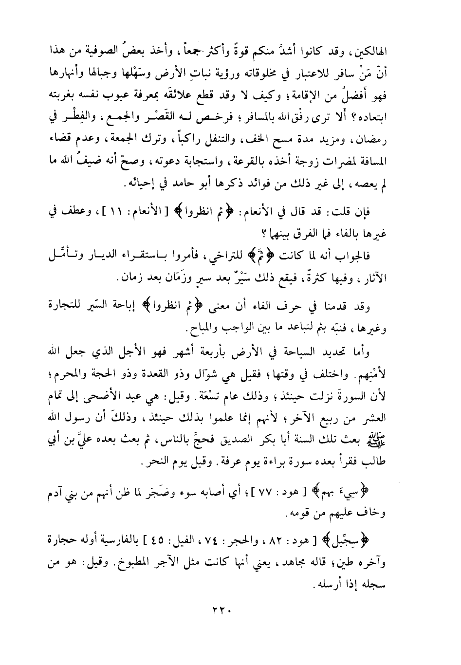 الهالكين، وقد كانوا أشد منكم قوةً وأكثر جمعاً، وأخذ بعضُ الصوفية من هذا أنَّ مَنْ سافر للاعتبار في مخلوقاته ورؤية نباتِ الأرض وسَهْلها وجبالها وأنهارها فهو أَفضل من الإقامة، وكيف لا وقد قطع علائقَه بمعرفة عيوب نفسه بغربة ابتعاده، ألا ترى رفق الله بالمسافر، فرخص له القَصْر والجمع، والفِطْر في رمضان، ومزيد مدة مسح الخف، والتنفل راكباً، وترك الجمعة، وعدم قضاء المسافة لمضرات زوجة أخذه بالقرعة، واستجابة دعوته، وصحّ أنه ضيفُ الله ما لم يعصه، إلى غير ذلك من فوائد ذكرها أبو حامد في إحيائه.