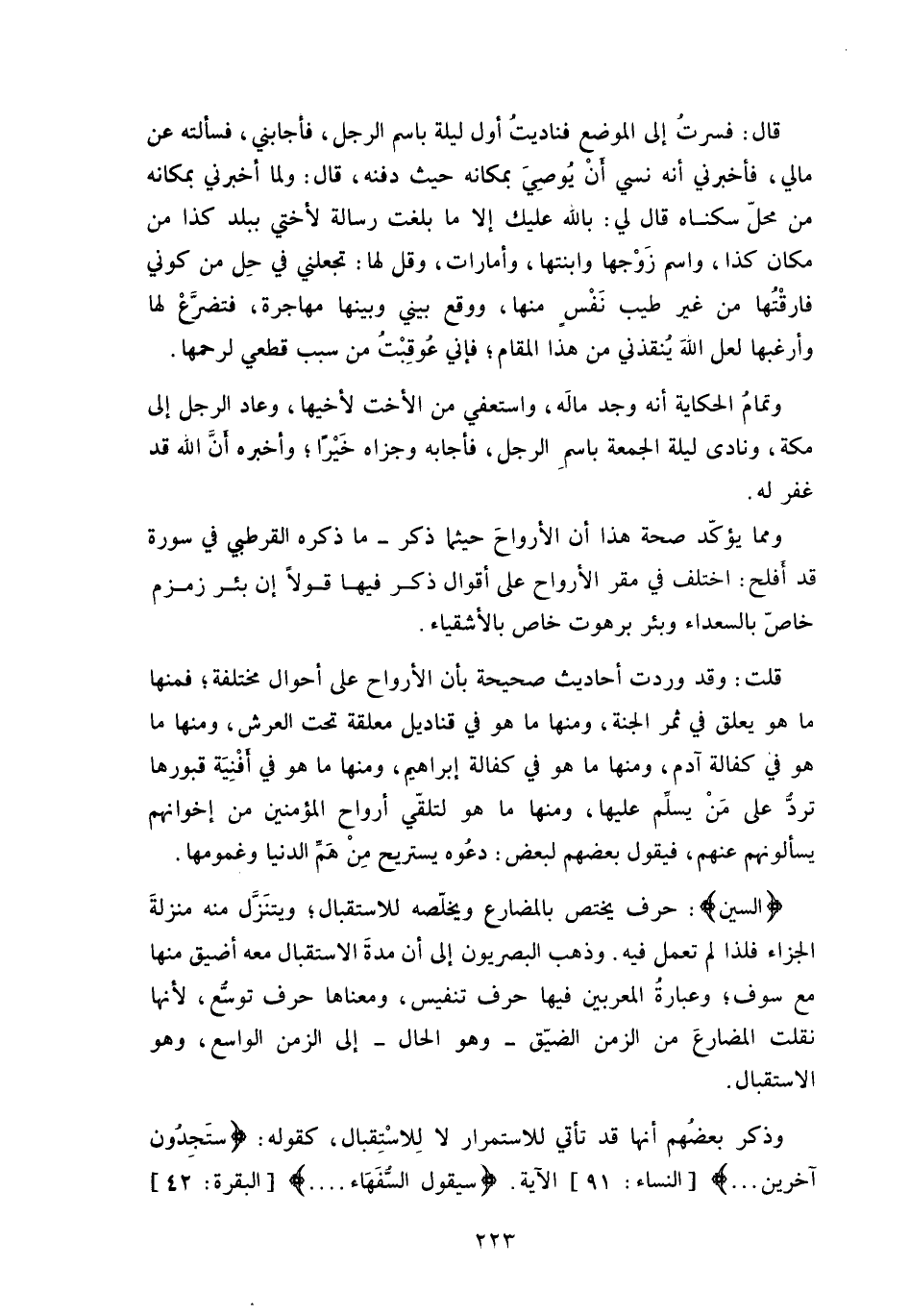 قال: فسرتُ إلى الوضع فناديتُ أول ليلة باسم الرجل، فأجابني، فسألته عن مالي، فأخبرني أنه نسي أنْ يُوصِيَ بمكانه حيث دفنه، قال: ولما أخبرني بمكانه من محلّ سكناه قال لي: بالله عليك إلا ما بلغت رسالة لأختي ببلد كذا من مكان كذا، واسم زَوْجها وابنتها، وأمارات، وقل لها: تجعلني في حِل من كوني فارقْتها من غير طيب نَفْس منها، ووقع بيني وبينها مهاجرة، فتضرَّعْ لها وأرغبها لعل اللَهَ يُنقذني من هذا المقام، فإني عُوقِبْتُ من سبب قطعي لرحمها.