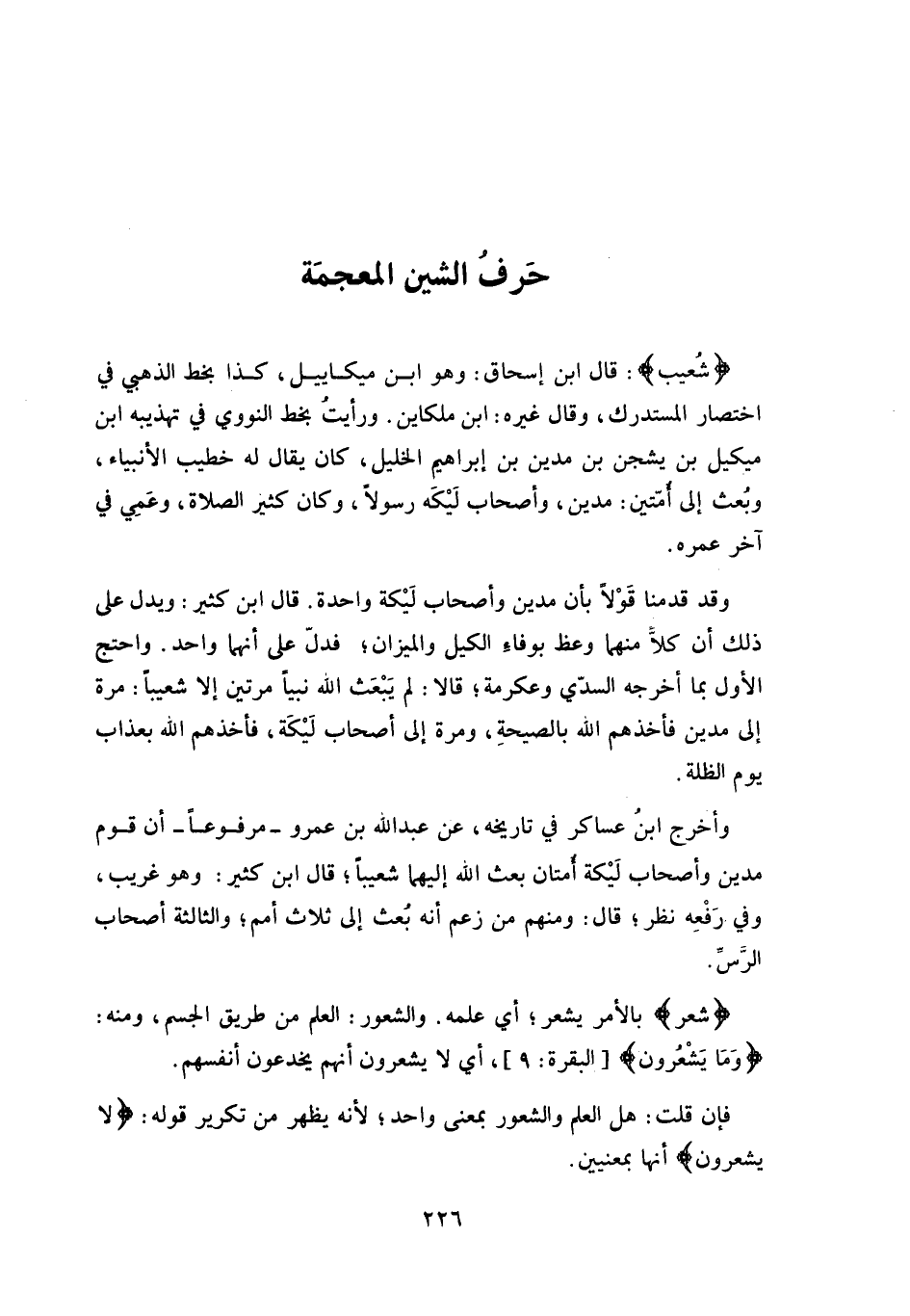 ورأيتُ بخط النووي في تهذيبه ابن ميكيل بن يشجن بن مدين بن إبراهيم الخليل، كان يقال له خطيب الأنبياء، وبُعث إلى أُمَّتين: مدين، وأصحاب الأيْكَه رسولا، وكان كثير الصلاة، وعَمِي في آخر عمره.