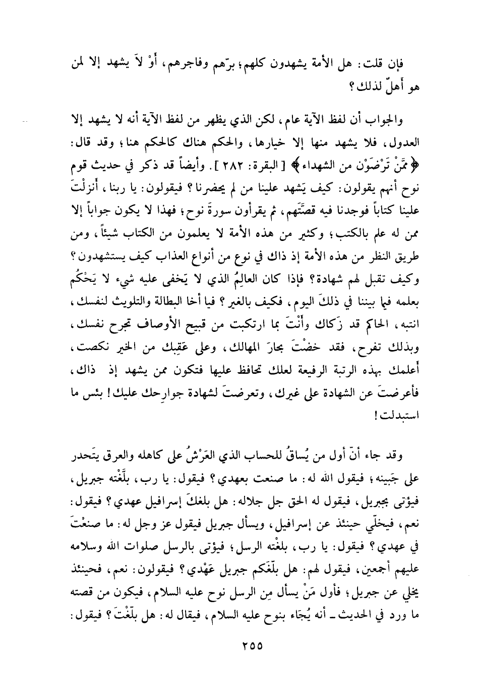 وأيضاً قد ذكر في حديث قوم نوح أنهم يقولون: كيف يَشهد علينا من لم يحضرنا، فيقولون: يا ربنا، أنزلْتَ علينا كتاباً فوجدنا فيه قصَّتَهم، ثم يقرأون سورةَ نوح، فهذا لا يكون جواباً إلا ممن له علم بالكتب، وكثير من هذه الأمة لا يعلمون من الكتاب شيئاً، ومن طريق النظر من هذه الأمة إذ ذاك في نوع من أنواع العذاب كيف يستشهدون، وكيف تقبل لهم شهادة، فإذا كان العالِم الذي لا يَخفى عليه شيء لا يَحكُم بعلمه فيما بيننا في ذلكَ اليوم، فكيف بالغير، فيا أخا البطالة والتلويث لنفسك، انتبه، الحاكم قد زَكاك وأنْتَ بما ارتكبت من قبيح الأوصاف تجرح نفسك، وبذلك تفرح، فقد خضْتَ بحارَ المهالك، وعلى عَقِبك من الخير نكصت.