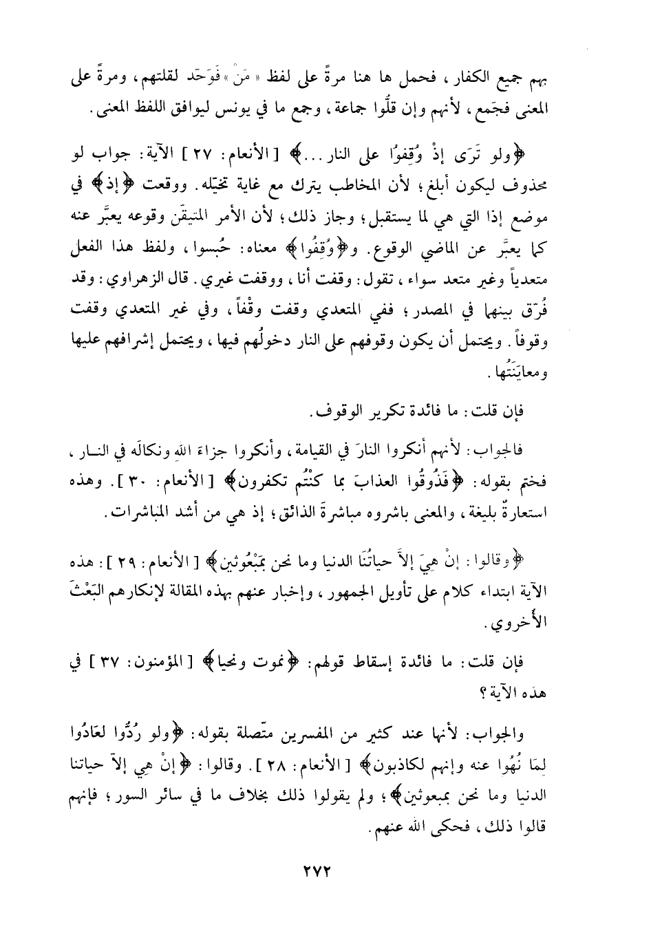 فإن قلت: ما فائدة تكرير الوقوف؟