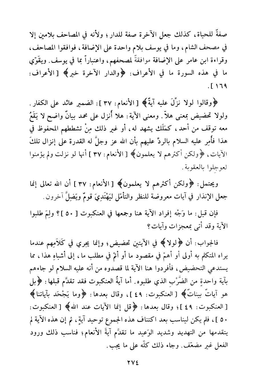 أما آية العنكبوت فقد تقدَّم قبلها: (بل هو آيات بيناتٌ) ، وقال بعدها: (وما يَجْحَد بآياتنا) ، وقال بعدها: (قل إنما الآيات عند الله) ، فلم يكن ليناسب بعد اكتناف هذه الجموع توحيد آيةٍ، ثم إن هذه الآية لم يتقدمها من التهديد وشديد الوَعيد ما تقدَّم آيةَ الأنعام، فناسب ذلك ورود