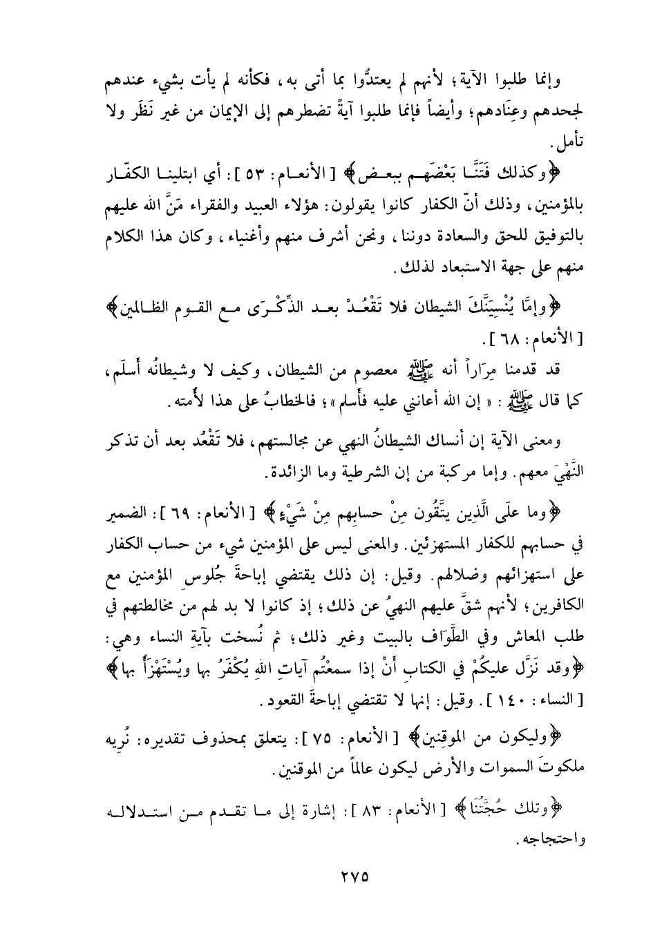 وقيل: إن ذلك يقتضي إباحةَ جلوسِ المؤمنين مع الكافرين، لأنهم شقَّ عليهم النهى عن ذلك، إذ كانوا لا بد لهم من مخالطتهم في طلب المعاش وفي الطَّوَاف بالبيت وغير ذلك، ثم نسخت بآيةِ النساء وهي: