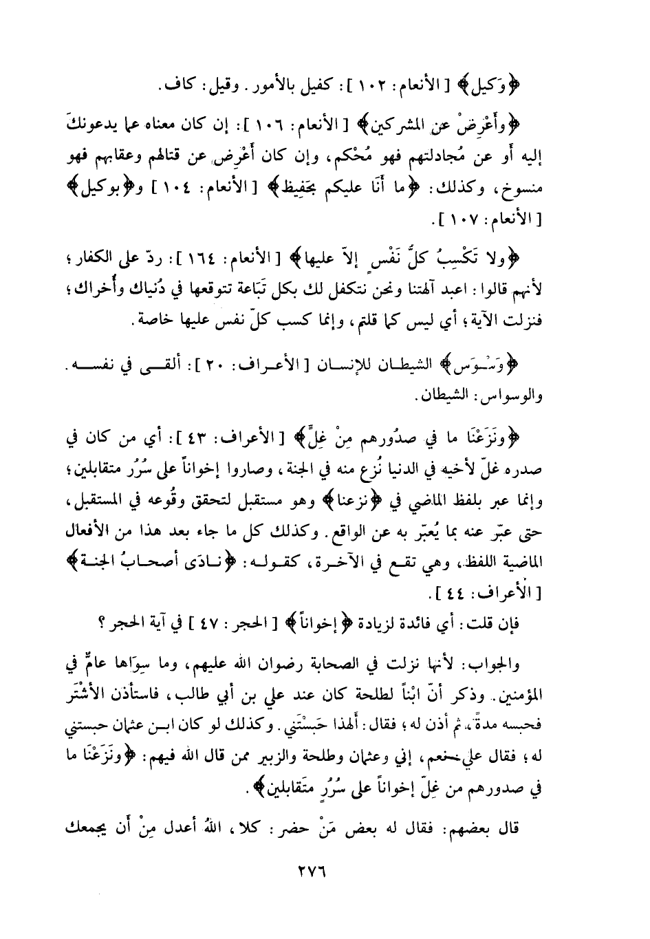 وكذلك لو كان ابن عثمان حبستني له، فقال علي نعم، إني وعثمان وطلحة والزبير ممن قال الله فيهم: (ونَزَعْنَا ما في صدورهم من غِل إخواناً على سُرُرٍ متَقابلين) .