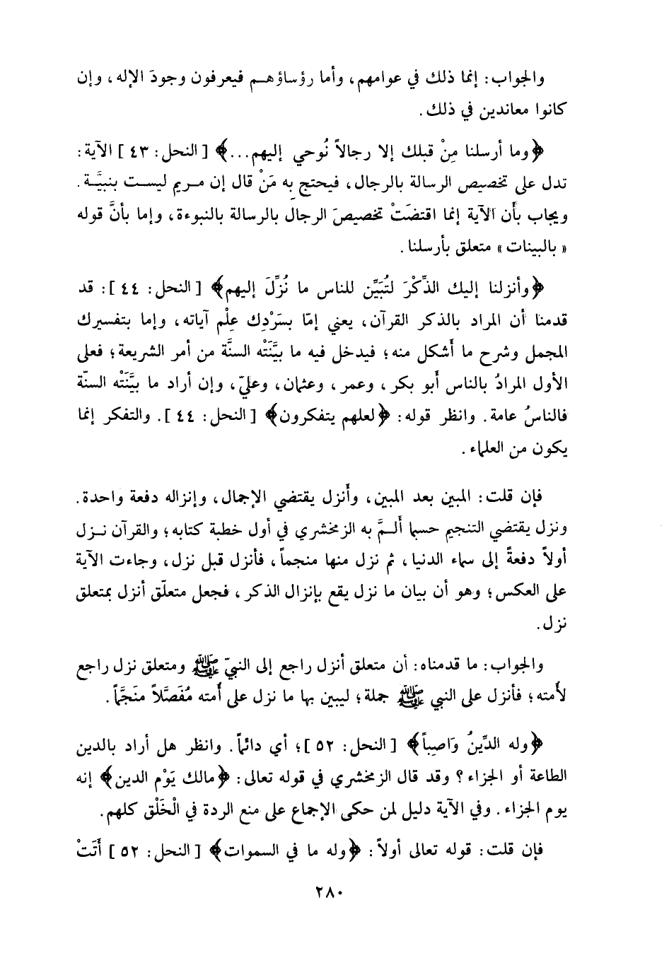 ونزل يقتضي التنجيم حسبما ألمَّ به الزمخشري في أول خطبة كتابه، والقرآن نزل أولاً دفعةً إلى سماء الدنيا، ثم نزل منها منجما، فأنزل قبل نزل، وجاءت الآية على العكس، وهو أن بيان ما نزل يقع بإنزال الذكر، فجعل متعلق أنزل بمتعلق نزل؟