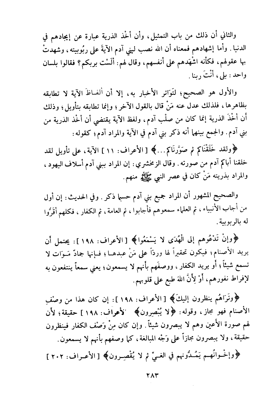 والثاني أن ذلك من باب التمثيل، وأن أخْذ الذرية عبارة عن إيجادهم في