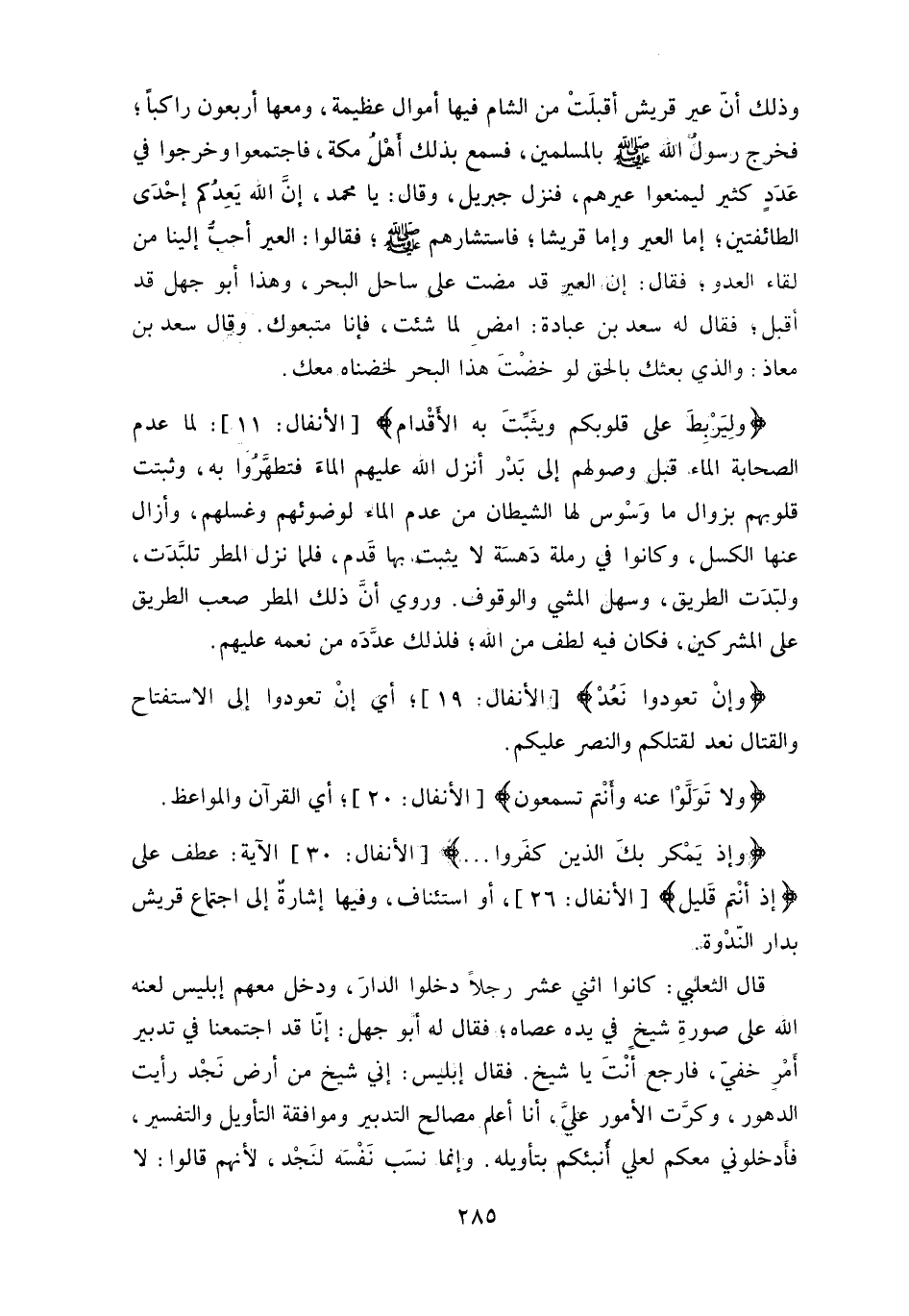 وذلك أنَّ عير قريش أقبلَتْ من الشام فيها أموال عظيمة، ومعها أربعون راكباً، فخرج رسول الله - صلى الله عليه وسلم - بالمسلمين، فسمع بذلك أهْلُ مكة، فاجتمعوا وخرجوا في عَدَدٍ كثير ليمنعوا عيرهم، فنزل جبريل، وقال: يا محمد، إنَ الله يَعِدُكم إحْدَى الطائفتين، إما العير وإما قريشا، فاستشارهم - صلى الله عليه وسلم -، فقالوا: العير أحبُّ إلينا من