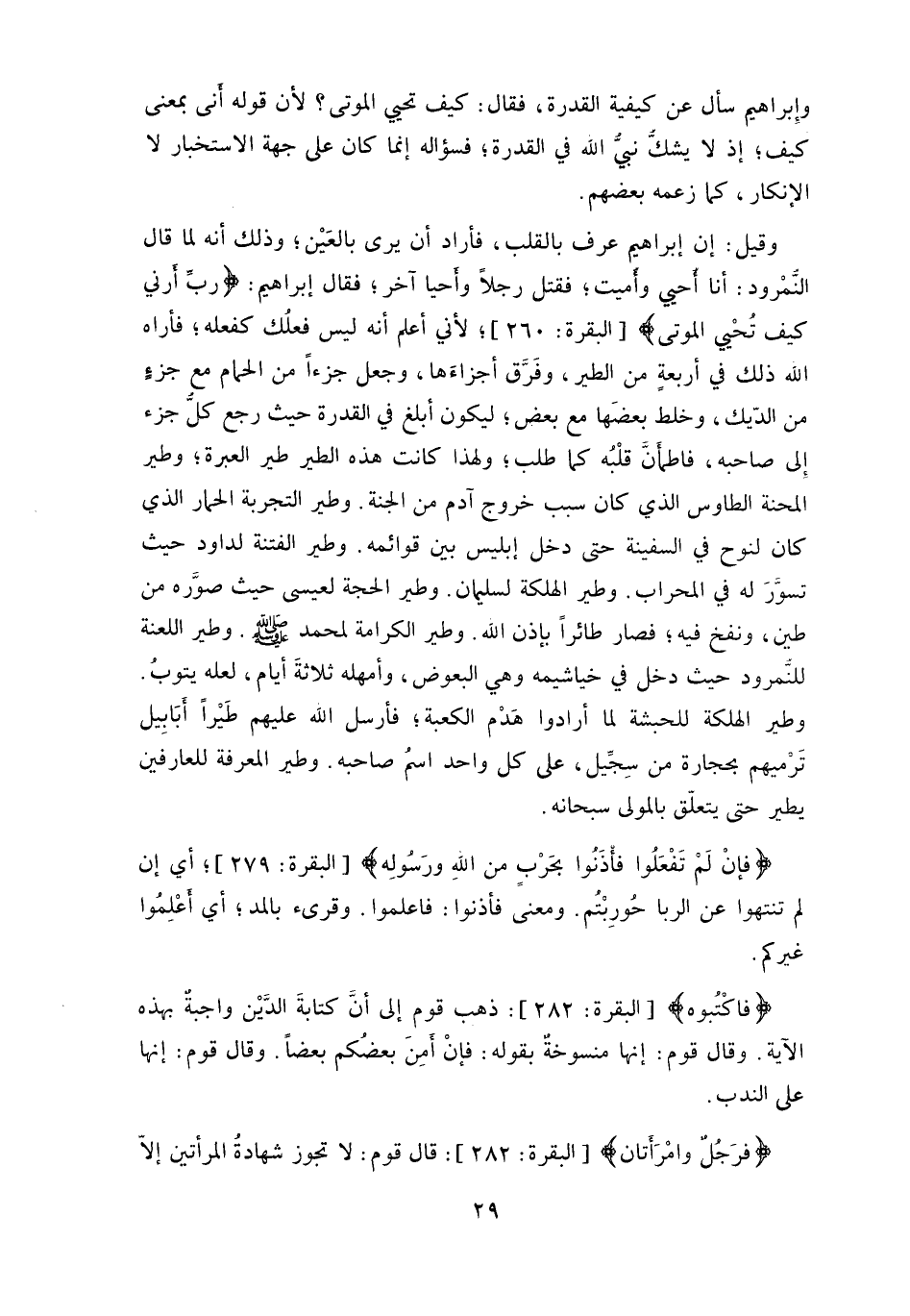الله ذلك في أربعةٍ من الطير، وفَرَّق أجزاءَها، وجعل جزءاً من الحمام مع جزءٍ من الدّيك، وخلط بعضَها مع بعض، ليكون أبلغ في القدرة حيث رجع كلّ جزء إِلى صاحبه، فاطمأنّ قلْبُه كما طلب، ولهذا كانت هذه الطير طير العبرة، وطير المحنة الطاوس الذي كان سبب خروج آدم من الجنة.