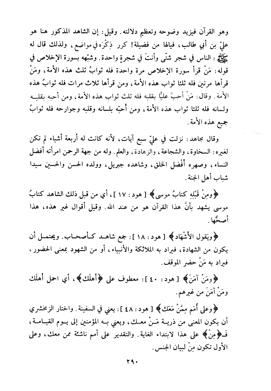وقيل: إن الشاهد المذكور هنا هو عليٌّ بن أبي طالب، فيالها من فضيلة! كرر ذِكْرَه في مواضع، ولذلك قال له - صلى الله عليه وسلم -: الناس في شجر شتّى وأنتَ في شجرةٍ واحدة.