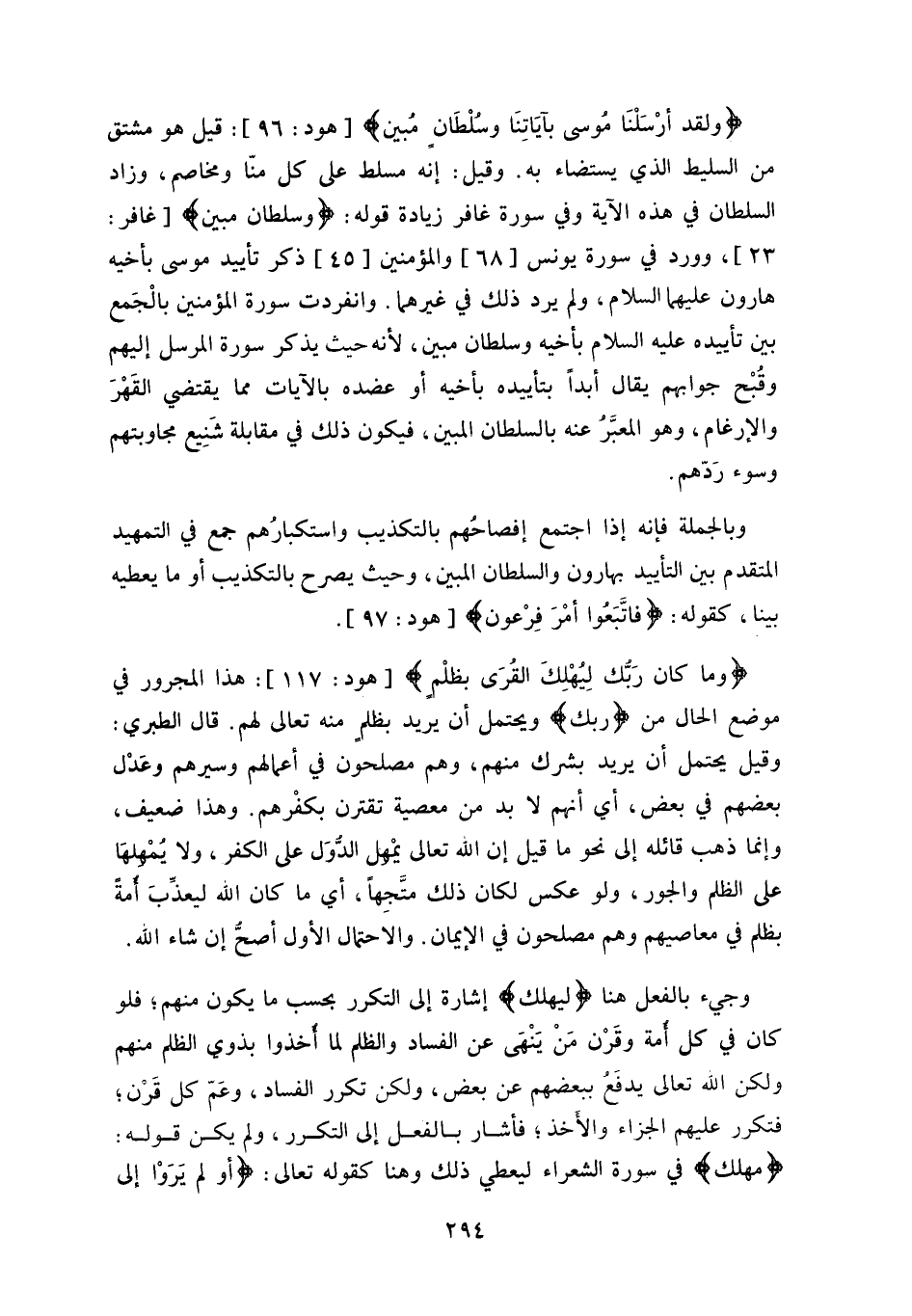 المتقدم بين التأييد بهارون والسلطان المبين، وحيث يصرح بالتكذيب أو ما يعطيه بينا، كقوله: (فاتبَعوا أمْرَ فِرْعون) .