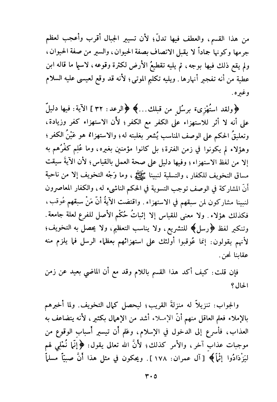 وتعليق الحكم على الوصف المناسب يُشعر بغلبته له، والاستهزاء هو عَيْن الكفر، وهؤلاء لم يكونوا في زمن الفترة، بل كانوا مؤمنين بغيره، وما عُلِم كفْرهم به إلا من لفظ الاستهزاء، وفيها دليل على صحة العمل بالقياس، لأن الآيةَ سيقت مساق التخويف للكفار، والتسلية لنبينا - صلى الله عليه وسلم -، وما وَجه التخويف إلا من ناحية أَن المشاركة في الوصف توجب التسوية في الحكم الناشء له، والكفار المعاصرون لنبينا مشاركون لمن سبقهم في الاستهزاء.