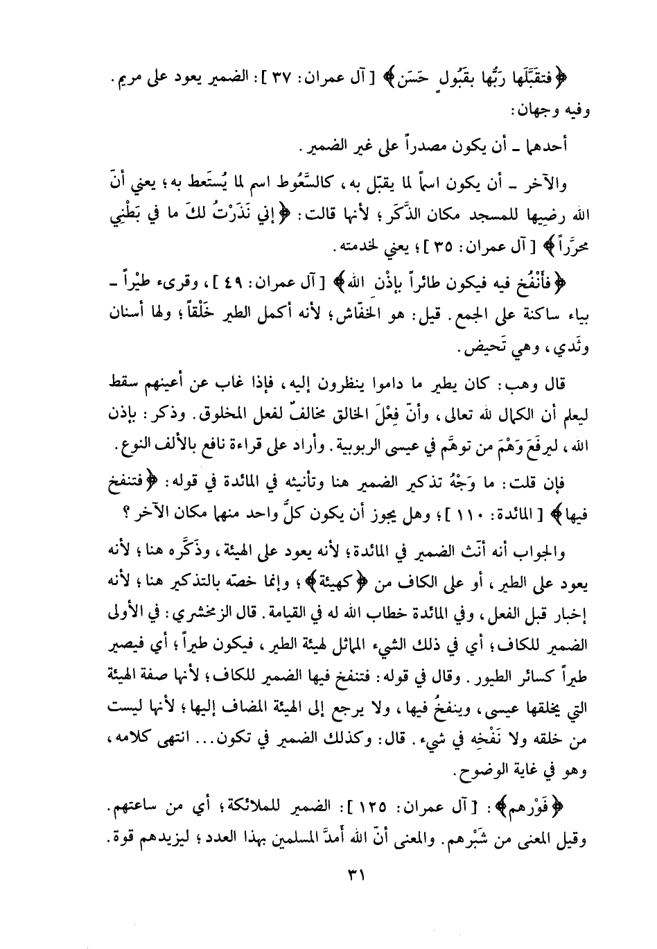 وقال في قوله: (فتنفخ فيها) الضمير للكاف، لأنها صفة الهيئة