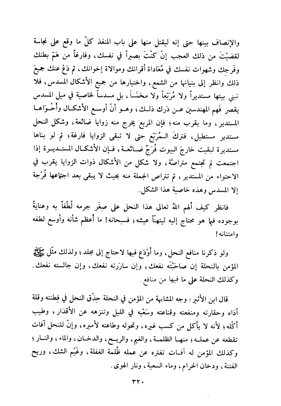 وفَرجِك وشهوات نفسك في معَاداة أقرانك وموالاة إخوانك، ثم دع عنك جميع ذلك وانظر إلى بنيانها من الشمع، واختيارها من جميع الأشكال المسدس، فلا تبني بيتها مستديرا ولا مُرَبّعاً ولا مخمَّساً، بل مسدساً لخاصية في ميل المسدس يقصر فَهم الهندسين عن دَرك ذلك، وهو أنَّ أوسع الأشكال وأحْوَاها المستدير، وما يقرب منه، فإن المربع يخرج منه زوايا ضائعة، وشكل النحل مستدير مستطيل، فتركَ المرَبّع حتى لا تبقى الزوايا فارغة، ثم لو بناها مستديرة لبقيت خارجَ البيوت فُرَجٌ ضائعة، فإن الأشكال المستديرة إذا اجتمعت لم تجتمع متراصَّة، ولا شكل من الأشكال ذوات الزوايا يقرب في الاحتواء من المستدير، ثم تتراص الجملة منه بحيث لا يبقى بعد اجتماعها فُرْجة إلا المسدس وهذه خاصية هذا الشكل.