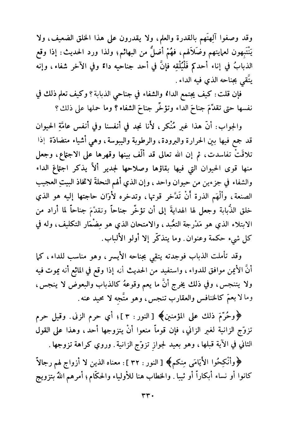 قد جمع فيها بين الحرارة والبرودة، والرطوبة واليبوسة، وهي أشياء متضادّة إذا تلاقَتْ تفاسدت، ثم إن الله تعالى قد ألّف بينها وقهرها على الاجتماع، وجعل منها قوى الحيوان التي فيها بقاؤها وصلاحها لجدير ألاَّ يذكر اجتماع الداء والشفاء في جزءين من حيوان واحد، وإن الذي أَلهمَ النحلةَ لاتخاذ البيتِ العجيب الصنعة، وألْهَم الذرة أنْ تَدَّخر قوتها، وتدخره لأوَان حاجتها إليه هو الذي خلق الذّبابة وجعل لها الهدايةَ إلى أن تؤخَر جناحا وتقدِّمَ جناحاً لما أراد من الابتلاء الذي هو مَدْرجة التعُّبد، والامتحان الذي هو مِضْمَار التكليف، وله في كل شيء حكمة وعنوان.