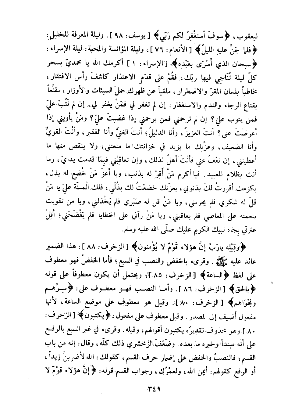 بكرمك أقررتُ لكَ بذنبي، بعزّتك خضعْت لك بذلّي، فلك الْمنَّة عليَّ يا مَنْ قلَّ له شكري فلم يحرمني، ويا مَنْ قل له صَبْري فلم يَخْذلني، ويا من تقويت بنعمته على المعاصي فلم يعاقبني، ويا مَنْ رآني على الخطايا فلم يفْضَحْني، أقِلْ عثرتي بِجَاهِ نبيك الكريم عليك صلَّى الله عليه وسلم.