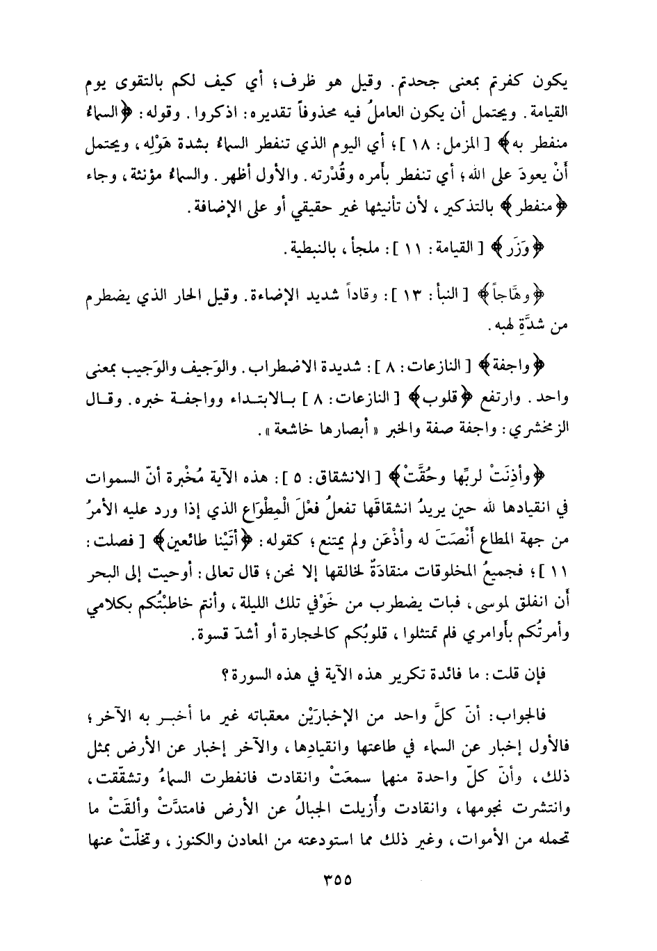 هذه الآية مُخْبرة أنَّ السماوات في انقيادها لله حين يريدُ انشقاقَها تفعلُ فعْلَ الْمِطْوَاع الذي إذا ورد عليه الأمر من جهة المطاع أنْصَتَ له وأذْعَن ولم يمتنع، كقوله: (أتَيْنا طائعين) ، فجميعُ المخلوقات منقادَةٌ لخالقها إلا نحن، قال تعالى: " أوحيت إلى البحر أن انفلق لموسى، فبات يضطرب من خَوْفي تلك الليلة، وأنتم خاطبْتُكم بكلامي وأمرتكم بأوامري فلم تمتثلوا، قلوبُكم كالحجارة أو أشدُّ قسوة ".