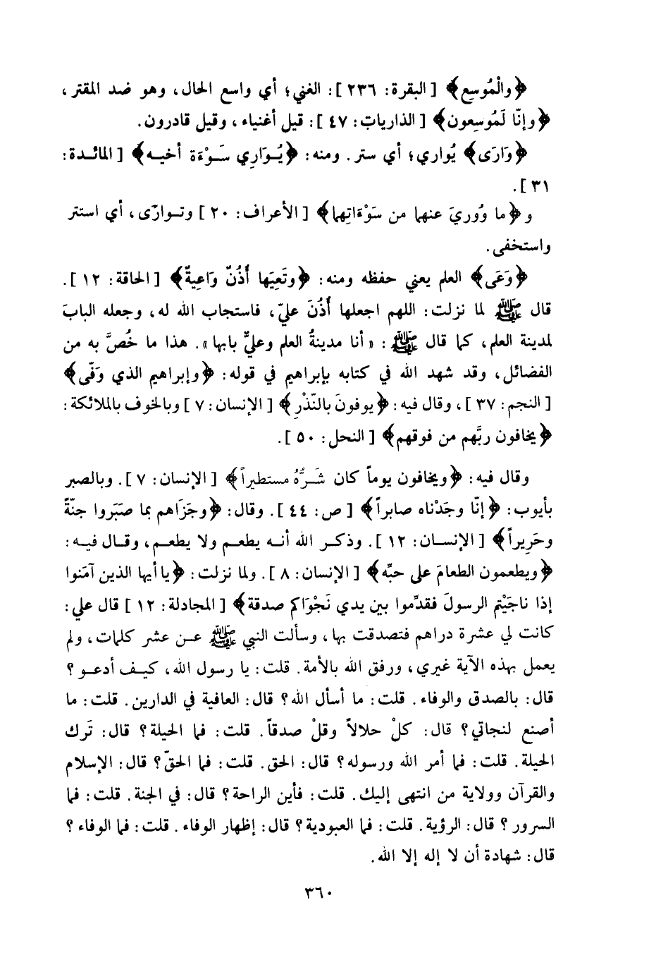 ولما نزلت: (يا أيها الذين آمَنوا إذا ناجَيْتم الرسولَ فقدِّموا بين يدي نَجْوَاكم صدقة) ، قال علي: كانت لي عشرة دراهم فتصدقت بها، وسألت النبي - صلى الله عليه وسلم - عن عشر كلمات، ولم يعمل بهذه الآية غيري، ورفق الله بالأمة.