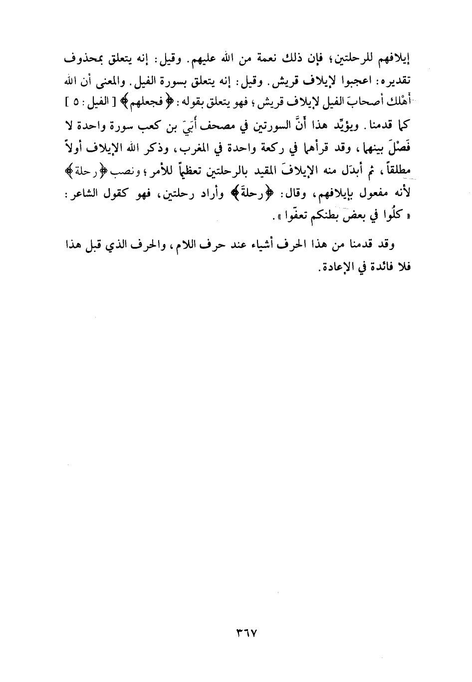 ويؤيد هذا أنَّ السورتين في مصحف أبَي بن كعب سورة واحدة لا فَصْلَ بينهما، وقد قرأهما في ركعة واحدة في المغرب، وذكر الله الإيلاف أولا