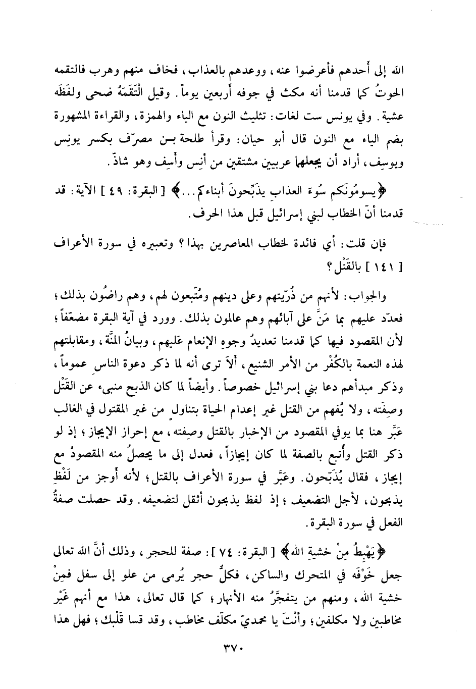 وأيضاً لما كان الذبح منبئ عن القَتْل وصِفَته، ولا يُفهم من القتل غير إعدام الحياة بتناول من غير المقتول في الغالب عَبَّر هنا بما يوفي المقصود من الإخبار بالقتل وصِفته، مع إحراز الإيجاز، إذ لو ذكر القتل وأتبع بالصفة لما كان إيجازاً، فعدل إلى ما يحصلُ منه المقصودُ مع إيجاز، فقال (يُذَبِّحون) .