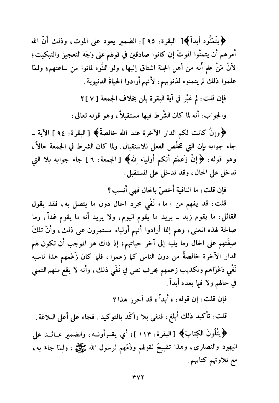 ولما كان الشرط في الجمعة حالاً، وهو قوله: (إنْ زَعمْتم أنكم أولياءِ للَه) ، جاء جوابه بلا التي تدخل على الحال، وقد تدخل على المستقبل.