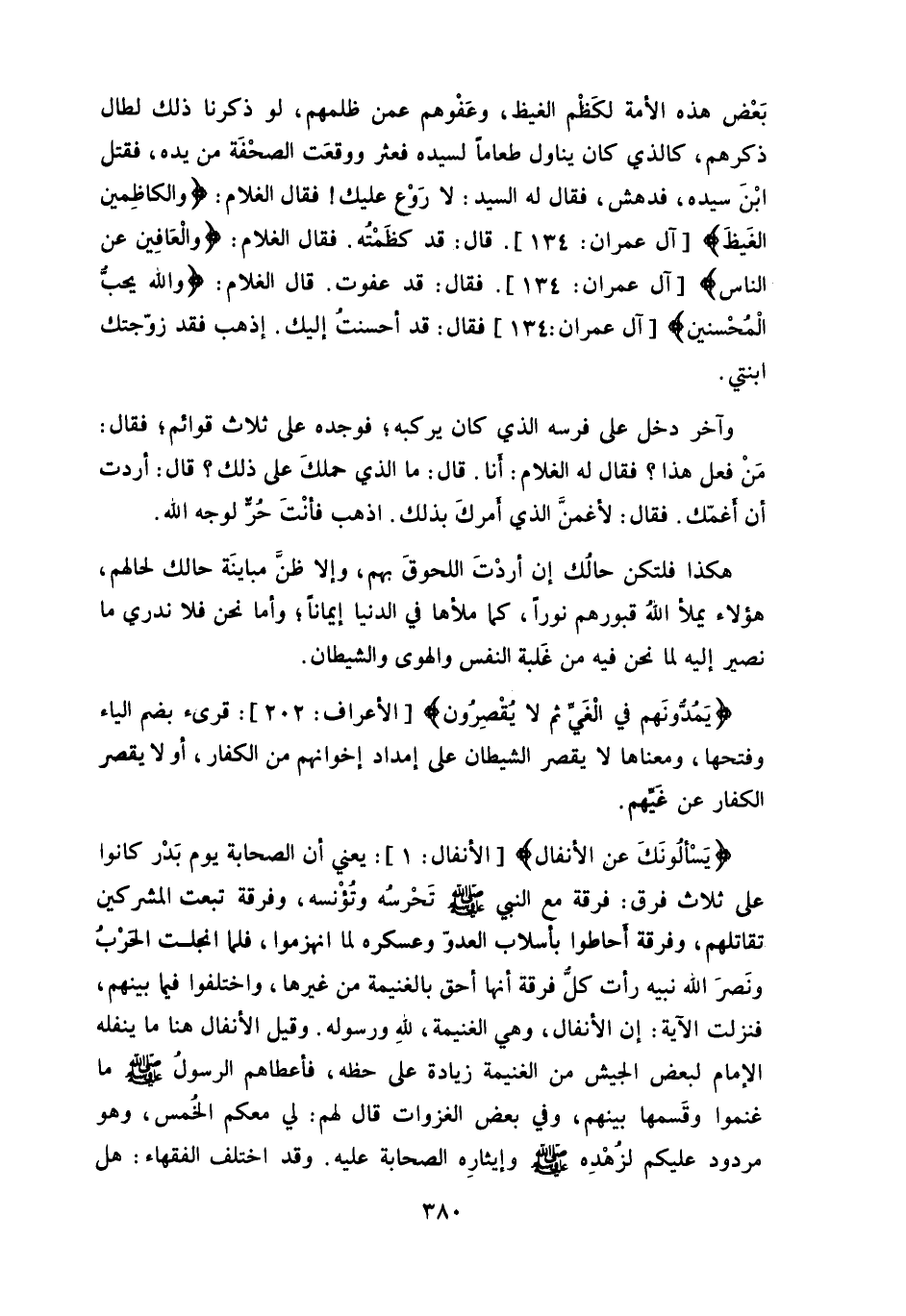 وقد وَفّق اللهُ بعْض هذه الأمة لكظْم الغيظ، وعَفْوهم عمن ظلمهم، لو ذكرنا ذلك لطال ذكرهم، كالذي كان يناول طعاما لسيده فعثر ووقعَت الصحْفَة من يده، فقتل ابْنَ سيده، فدهش، فقال له السيد: لا رَوْع عليك! فقال الغلام: (والكاظِمين الغَيظَ) .