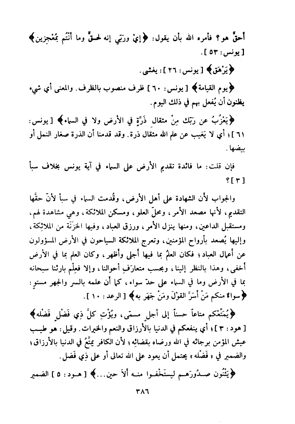 التقديم، لأنها مصعد الأمر، ومحلّ العلو، ومسكن الملائكة، وهي مشاهدة لهم، ومستقبل الداعين، ومنها ينزل الأمر، ورزق العباد، وفيها الخزَنَة من الملائِكة، وإليها يُصعد بأرواح المؤمنين، وتعرج الملائكة السياحون في الأرض المسؤولون عن أعمال العباد، فكان العلمُ بما فيها أجلى وأظهر، وكان العلم بما في الأرض أخفى، وهذا بالنظر إلينا، وبحسب متعارَفِ أحوالنا، وإلا فعِلْم بارئنا سبحانه بما في الأرض وما في السماء على حدٍّ سواء، كما أن علمه بالسر والجهر مستوٍ: (سواءٌ منكم مَنْ أسَرَّ القوْلَ ومَنْ جَهَر به) .