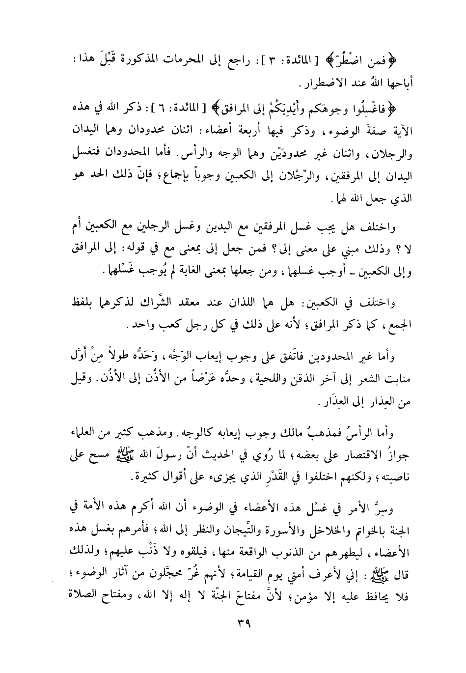الجنة بالخواتم والخلاخل والأسورة والتِّيجان والنظر إلى الله، فأمرهم بغسل هذه الأعضاء، ليطهرهم من الذنوب الواقعة منها، فيلقوه ولا ذَنْب عليهم، ولذلك قال - صلى الله عليه وسلم -: " إني لأعرف أمتي يومِ القيامة، لأنهم غرّ محجلون من آثار الوضوء ".