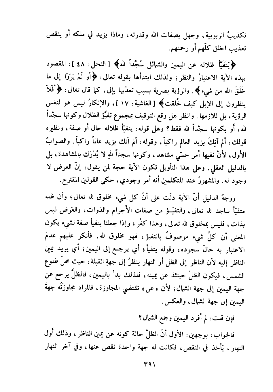 وانظر هل وقع التوقيف بمجموع تفيّؤ الظلال وكونها سجداً لله، أو بكونها سجداً لله فقط، وهل قوله: يتفيّأ ظلاله حال أو صفة، ونظيره
